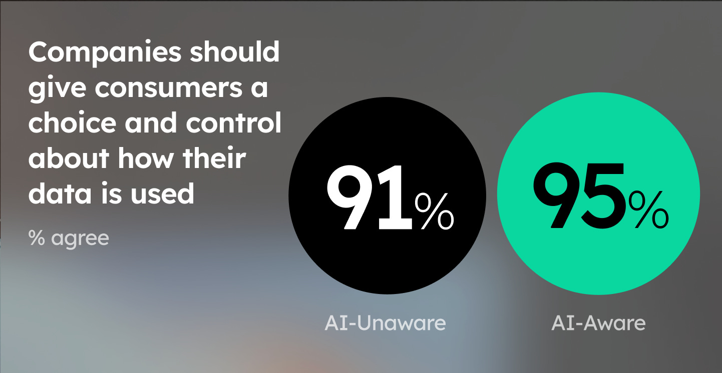To start, there’s an overwhelming consensus of Americans, over 90%, that “companies should give consumers a choice and control about how their data is used.” Beyond the fact that 90% of Americans hardly agree on anything, what’s notable is that the number is even higher among people who are “AI Aware”, meaning people who are familiar with AI technology.