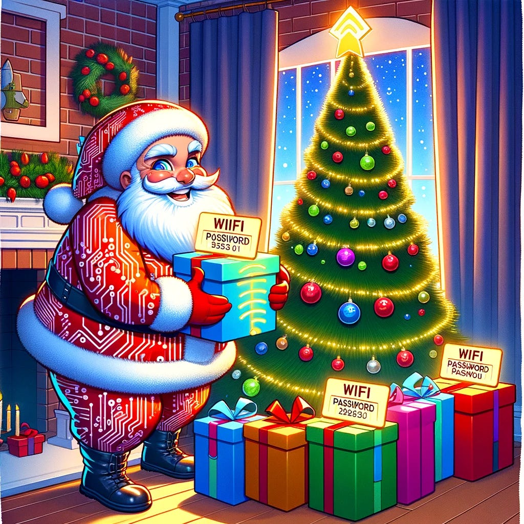 DallE’s depiction of a Data Privacy Santa Claus bringing wifi passwords for all the little children