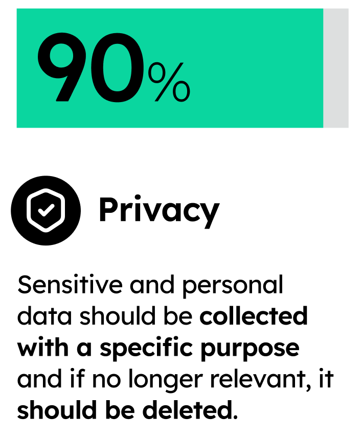 The last 10-20 years of constant abuse when it comes to personal data and people’s digital lives has taken a toll. When we asked if people agreed that, “sensitive and personal data should be collected with a specific purpose and if personal data is no longer relevant to the purpose for which it was collected, it should be deleted,” over 90% said yes. Simply put, people want caution and care when a business collects their data.