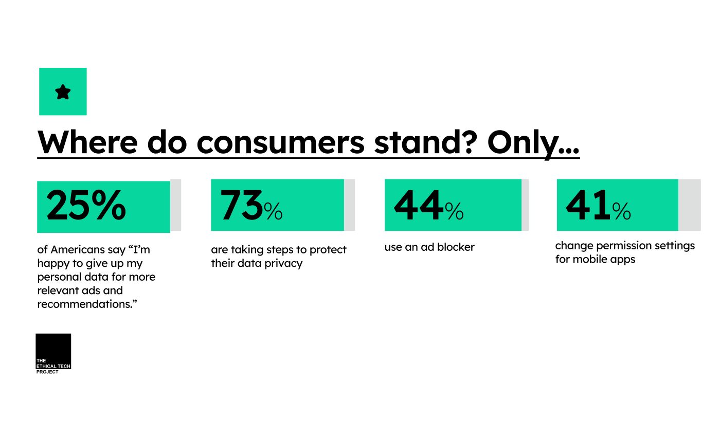 We’ll do a deep dive in a few weeks on our conjoint analysis that gets to the heart of the “revealed preference” argument, but the fact of the matter is people aren’t happy with the tradeoffs made by many tech companies and there’s no way to spin this as a positive. Only 25% of respondents agreed that “I’m happy to give up my personal data for more relevant ads and recommendations.” Consumers aren’t just unhappy. They’re taking action (showing their hand that their true revealed preference is aligned with what consumers say!). 73% of Americans are taking steps to protect their data privacy, 44% use an ad blocker, and 41% change permission settings for mobile apps.