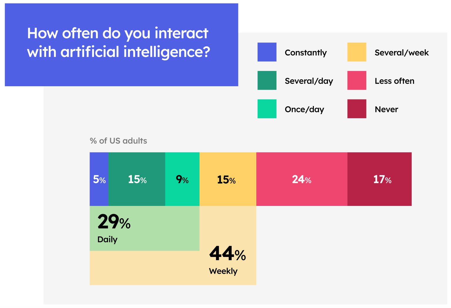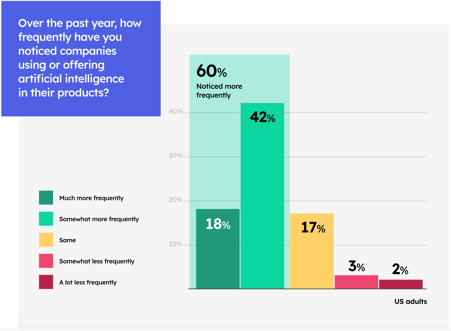 While the vast majority of consumers have encountered AI in some capacity, we’re still early in the adoption phase as people figure out how AI benefits their daily lives. Check out the question below:
