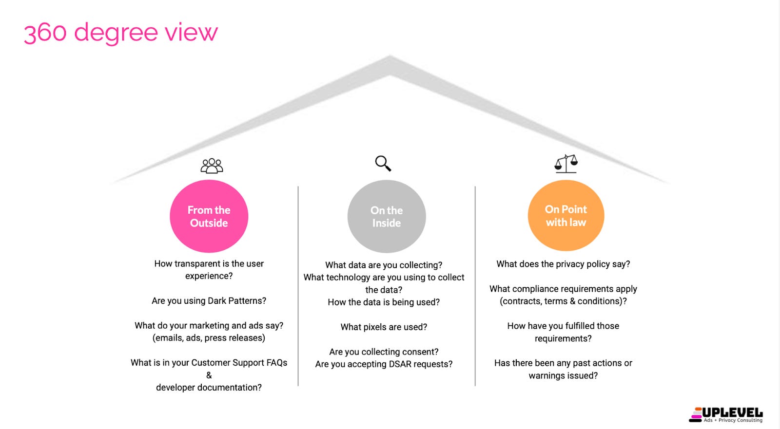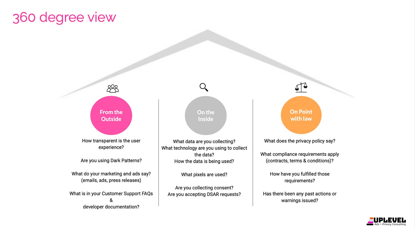 One of the ways to get started is to assess the organization's current practices. Conduct an audit or assessment of sorts. At Uplevel, we conduct an ‘issue spotting’ discovery, which is a specialized methodology designed based on our specific experiences at the Federal Trade Commission. This uncovers areas of improvement from the vantage points of consumers, business and regulators.